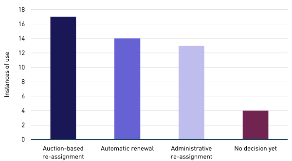 Benchmarking the action taken upon expiry of mobile spectrum licences across 43 countries since 2006, we have found that regulators use three main categories of approach, with similar frequency.