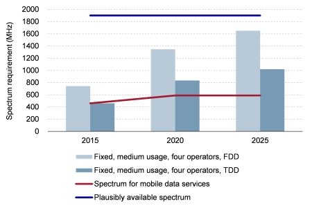 Under these assumptions, the report finds that spectrum demand is very likely to exceed the currently planned supply of spectrum. Thus, to meet the level of demand calculated in this scenario, additional spectrum would have to be awarded, and spectrum demand could reach 1700MHz by 2025. Taking into account spectrum already used or planned to be used, this leaves around 600MHz shortfall to be met through identification of additional