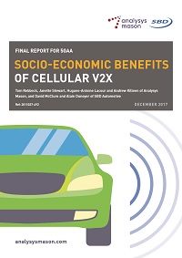 Brussels, 5 December 2017 – The 5GAA today published a report, authored by independent telecoms, media and technology consultants Analysys Mason together with automotive consultancy SBD Automotive, which assesses the benefits of cellular vehicle to everything (C-V2X) technology for delivery of vehicle-to-everything (V2X) communication. The report, which has a focus on the benefits of such solutions in Europe, uses qualitative evidence, and describes quantitative cost–benefit analysis that the consultants have undertaken, relating to deployment of C-V2X.