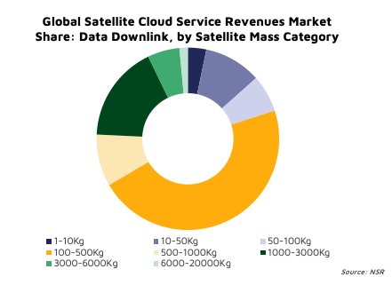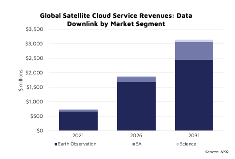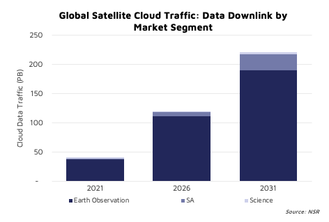 NSR forecasts approximately 1.4 EB of data volume from EO, Science, and Situational Awareness (SA) applications delivered via cloud servers by 2031. The commercial segment drives a majority of revenues, taking up about 54% of the cumulative opportunity from 2021 to 2031, with significant demand from the 'heavyweight' 100-500 Kg satellite mass category.